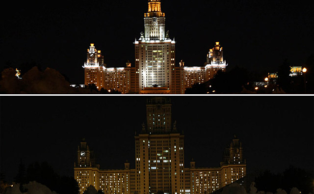 俄羅斯莫斯科:3月28日俄羅斯莫斯科大學熄燈前(上)和熄燈后(下)的對比情況。