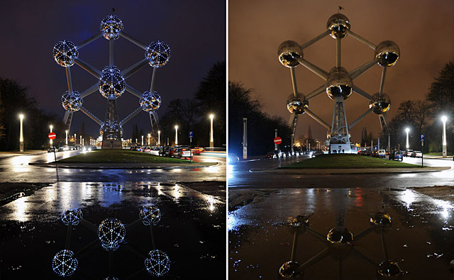比利時(shí)布魯塞爾:3月28日20點(diǎn)30分,比利時(shí)首都布魯塞爾的景觀建筑“原子球”在熄滅景觀照明前后的情景對(duì)比。