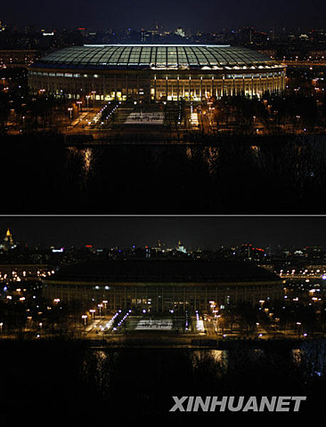 俄羅斯莫斯科:3月28日20時(shí)30分后,1980年莫斯科奧運(yùn)會主體育場盧日尼基體育場熄燈前和熄燈后的對比情況。魯金博 攝(圖片來源:新華網(wǎng))