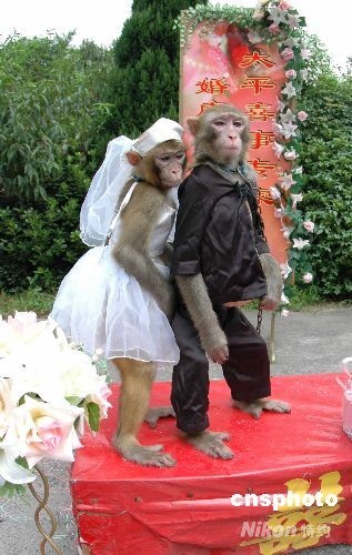 9月4日上午,浙江省溫嶺動物園為發(fā)育成熟的兩只猴子和兩只狗熊,策劃兩場特殊的“婚禮”。所謂“悟空”夫妻,“新郎”名叫悟空,“新娘”名叫小丫;“狗熊”夫妻,“新郎”名叫大黑,“新娘”名叫二蘭。中新社發(fā) 江勇兵 攝