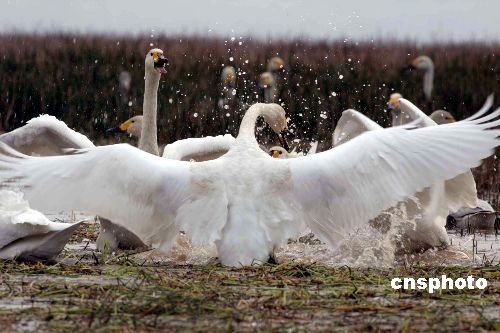 2008年11月15日,數(shù)千只大天鵝陸續(xù)飛抵江西九江縣東湖棲息覓食。由于鄱陽(yáng)湖水位上漲,以及當(dāng)?shù)丨h(huán)境適宜等原因,大量國(guó)家二級(jí)保護(hù)動(dòng)物天鵝前來越冬。中新社發(fā) 張 俊 攝