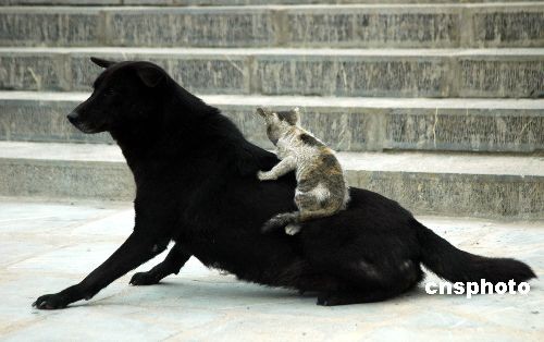 11月16日,一只小貓趴在黑狗的背上。安徽巢湖市居巢區(qū)散兵鎮(zhèn)凌山村一農(nóng)戶(hù)家里養(yǎng)著一只花貓和兩條狗。據(jù)主人介紹,小花貓因還在喝奶的時(shí)候,貓媽媽就病死了,營(yíng)養(yǎng)不良,所以已經(jīng)一歲多的小花貓長(zhǎng)得很瘦弱,兩條狗卻像貓媽媽那樣愛(ài)護(hù)著它,小花貓有時(shí)很頑皮,騎在狗背上玩耍,構(gòu)成一幅貓狗一家親令人感動(dòng)的圖畫(huà)。中新社發(fā) 徐振華 攝