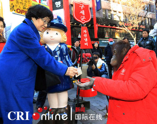 2008年12月15日,一只來(lái)自韓國(guó)高陽(yáng)一家動(dòng)物園的猩猩當(dāng)日現(xiàn)身首爾明洞街頭,為慈善組織“救世軍”募捐。“救世軍”本月初開始在韓國(guó)各大城市街頭接受社會(huì)捐贈(zèng)。