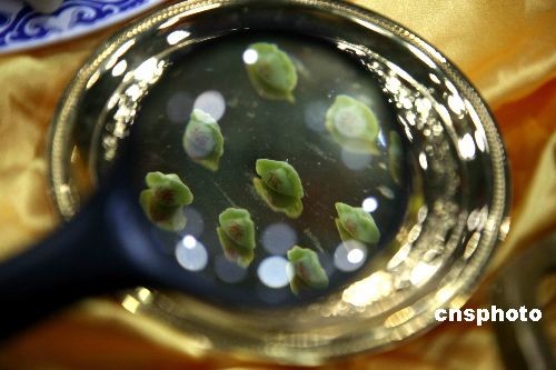 世界上最小的餃子有多大?12月20日上午,在濟(jì)南舉辦的第二屆齊魯民間膳食文化藝術(shù)節(jié)開幕式上,直徑僅有8毫米的齊魯珍珠餃亮相。餃子的餡由珍珠泉內(nèi)養(yǎng)殖的花蓮魚肉調(diào)成,每個(gè)上面還有文字,須通過放大鏡才能看清。中新社發(fā) 王輝 攝