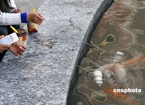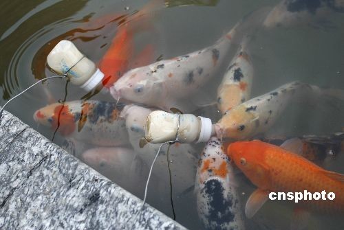 3月中旬,工作人員喂養(yǎng)“喝奶”的魚。在浙江東陽(yáng)橫店影視城香港街景點(diǎn)內(nèi),養(yǎng)在水壇中的觀賞錦鯉是普通錦鯉與日本某錦鯉雜交后培育的品種,喂養(yǎng)它們則需要將飼料裝灌進(jìn)嬰幼兒奶瓶中,該飼料的顏色如“乳奶”一般,然后將奶瓶用鐵絲系住放入水中,隨后,這些魚兒就會(huì)圍攏過(guò)來(lái),爭(zhēng)搶著用奶嘴吸“奶”喝了。
