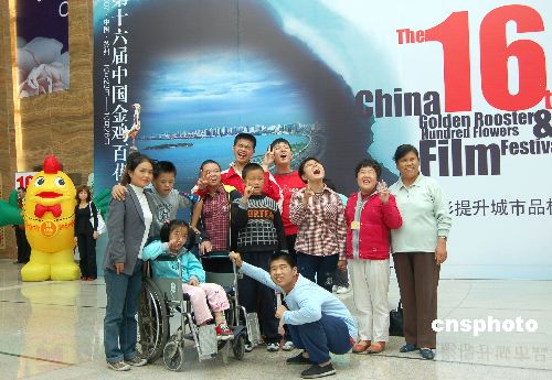 10月26日,蘇州市平江區(qū)培智學(xué)校組織近百名殘疾兒童到蘇州“鳥巢”——科技文化中心,感受正在舉行的第十六屆中國(guó)金雞百花電影節(jié)。圖為殘疾兒童在老師的陪同下高興地在電影節(jié)吉祥物前合影留念。中新社發(fā) 邱勇 攝