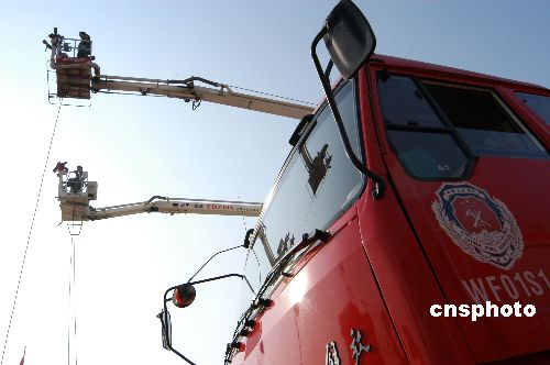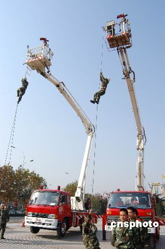 2007年11月7日,山東濰坊消防部門在濰坊富華國際展覽中心舉行消防演習,迎接11月9日消防日的到來。中新社發(fā) 王志德 攝
