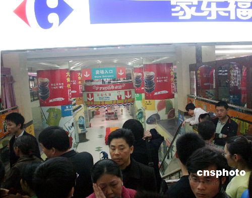 11月10日上午8時20分左右,重慶沙坪壩區(qū)家樂福商場內(nèi),發(fā)生一起因爭搶特價食用油造成的踩踏傷亡事故。目前已致3人死亡31人受傷,其中7人傷勢嚴重。圖為事故發(fā)生后,該超市隨即暫停營業(yè),超市門口聚集大批當?shù)厥忻。中新社發(fā) 郭晉嘉 攝