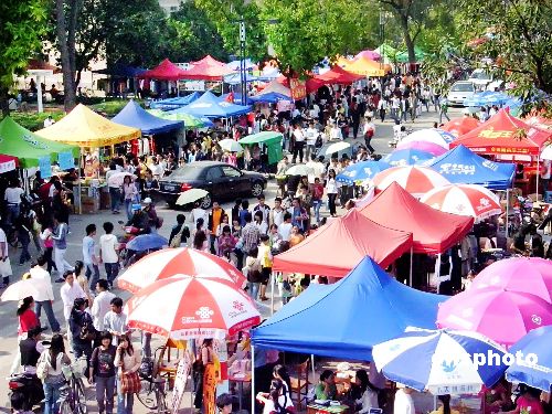 2007年11月9-10日,廣西大學(xué)一年一度的校園運(yùn)動(dòng)會(huì)舉行。每年的運(yùn)動(dòng)會(huì)期間,學(xué)生們都主動(dòng)到社會(huì)拉商家贊助,只要商家贊助,學(xué)校就允許商家在運(yùn)動(dòng)會(huì)現(xiàn)場周邊擺攤經(jīng)營。今年商家的進(jìn)入達(dá)到高峰,校園主干道密密麻麻地?cái)[滿了小攤,人頭涌動(dòng),車水馬龍,整個(gè)校園就像一個(gè)露天大超市。中新社發(fā) 駱文剛 攝
