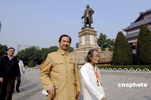 十一月十二日,廣州市各界人士在廣州中山紀念堂廣場孫中山先生銅像前,舉行紀念孫中山先生誕辰141周年紀念活動,并向?qū)O中山先生銅像敬獻花籃。圖為扮演孫中山先生的演員和社會知名人士參加了紀念儀式。中新社發(fā) 劉衛(wèi)勇 攝