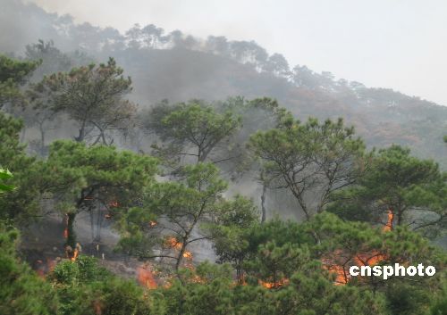 十一月十一日零晨廣東鼎湖富廊村的北嶺山林場(chǎng)布基工區(qū)發(fā)生山火,到十二日記者發(fā)稿時(shí)止,總過(guò)火面積約四千畝,現(xiàn)場(chǎng)東線桃園工區(qū)火勢(shì)得到較好控制,但山火仍在全力撲救中,當(dāng)?shù)匾颜{(diào)集二千五百人次撲救,并出動(dòng)兩架直升飛機(jī)從空中灑水彈滅火,暫未收到人員傷亡的報(bào)告。中新社發(fā) 黃耀輝 攝