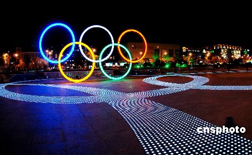 11月27日,大連市奧林匹克廣場流光溢彩。日前,大連市利用高科技對奧林匹克廣場地面進行了改造,在地面新建5個直徑為38米,能變換多種色彩的奧運五環(huán)標志圖案,成為大連市夜間格外壯觀的一景。中新社發(fā) 劉德斌 攝