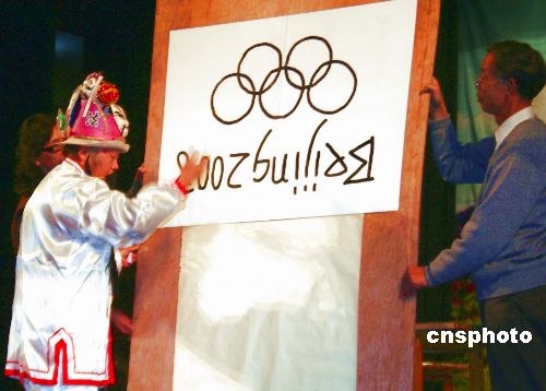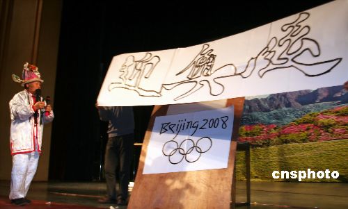 11月29日,遼寧沈陽(yáng)鄭錫平在八一劇場(chǎng)北方老齡藝術(shù)團(tuán)5周年年慶會(huì)上,用自制的自來(lái)水毛筆表演“倒著一筆”分別寫完“2008北京奧運(yùn)”、“五環(huán)”、“迎奧運(yùn)”等,得到與會(huì)人員的贊嘆。