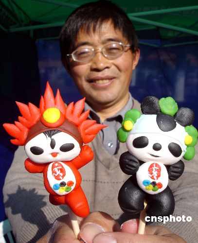 2007年12月5日,蘇州面塑藝人呂樹華用一雙巧手捏出的奧運(yùn)福娃造型面塑作品,形象逼真、可愛,表達(dá)了他對(duì)2008年奧運(yùn)會(huì)的美好祝愿。中新社發(fā) 王建康 攝