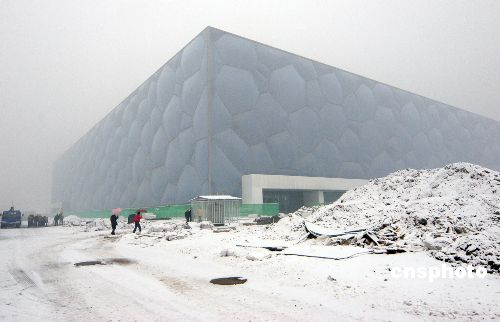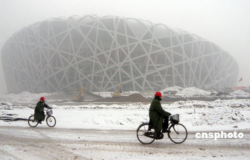 12月10日晨,北京降下今冬第一場雪,奧運場館“鳥巢”、“水立方”在雪中朦朦朧朧,顯得分外妖嬈。中新社發(fā) 吳芒子 攝