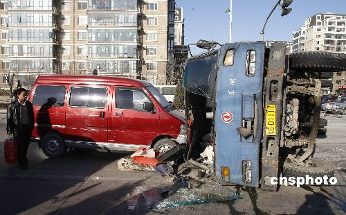 十二月十五日,北京天通苑小區(qū)門前道路,一輛拉載水泥板的大型貨車在路口拐彎時側翻,造成交通堵塞。中新社發(fā) 廖文靜 攝