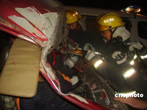 12月24日,山東棗莊發(fā)生一起兩車追尾事故。當?shù)叵乐ш犔厍谥嘘牻拥綀缶,派?2名消防官兵、一輛搶險救援車和一輛水罐車。經過近半個小時施救,2名被困人員成功獲救。中新社發(fā) 季龍 攝