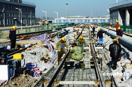 北京地鐵10號(hào)線萬柳車輛段,工作人員在加緊軌道工程建設(shè),并對(duì)首批車輛進(jìn)行檢測調(diào)試工作。