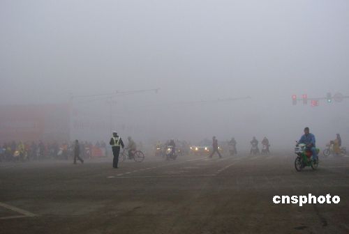 2008年1月7日,江蘇連云港遭遇大霧天氣,能見度不足50米,市民們謹(jǐn)慎出行!叭拧鼻跋ΓB云港最高溫度達(dá)到12℃,一直保持升高回暖的態(tài)勢,極易形成大霧天氣。中新社發(fā) 耿玉和 攝