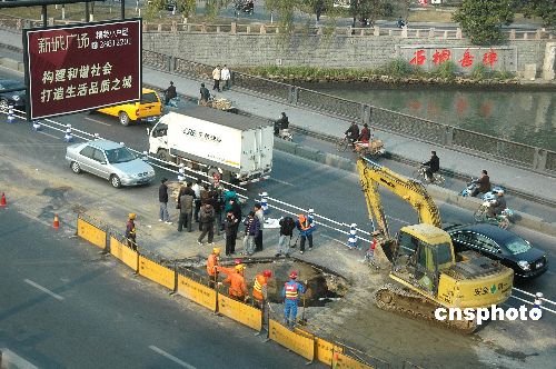 1月7日,杭州艮山運河橋機動車道橋面發(fā)生局部坍塌事故,坍塌形成的窟窿直徑約5米,深約2米,面積達30多平方米,所幸沒有造成人員傷亡和車輛受損,但對交通造成較大影響,具體原因尚待有關(guān)部門調(diào)查。據(jù)了解,艮山運河橋始建于1988年,由于交通流量較大,曾多次進行過比較全面的修繕和拓寬,該橋曾發(fā)生過橋面人行道突然坍塌導(dǎo)致行人墜落的事故。中新社發(fā) 引煒 攝
