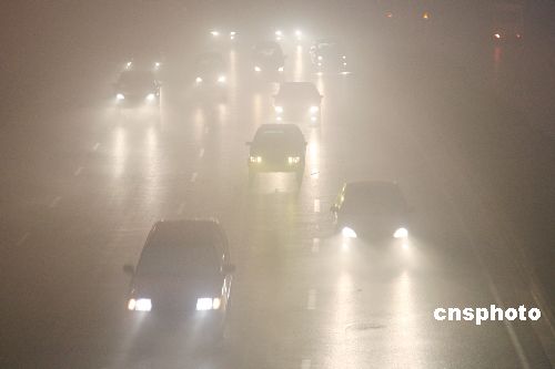 1月9日,汽車在霧中緩慢行駛。當(dāng)日,南京出現(xiàn)大霧天氣,局部路段能見度小于50米,給城市交通和市民出行帶來不便,當(dāng)?shù)貧庀蟛块T先后發(fā)布大霧橙色預(yù)警信號(hào)和大霧紅色預(yù)警信號(hào),提醒市民不要進(jìn)行戶外活動(dòng)。中新社發(fā) 鐘山 攝