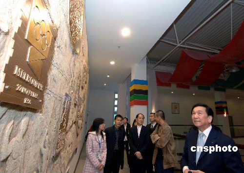 中國臺北國際奧委會委員吳經(jīng)國先生(右一),在廈門奧林匹克博物館向來賓介紹歷屆夏季奧運(yùn)會海報浮雕墻。