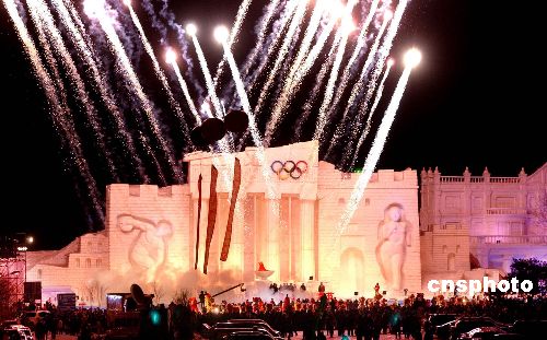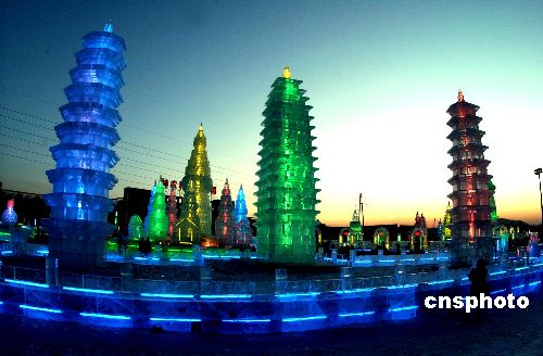 1月11日晚,2008中國(guó)沈陽(yáng)國(guó)際冰雪節(jié)開(kāi)幕。本屆冰雪節(jié)的雪雕和冰雕超越歷屆冰雪節(jié),創(chuàng)下數(shù)量、高度和規(guī)模之最。開(kāi)幕式上《從雅典到北京》、《龍騰奧運(yùn)》等六座大型雪雕與杭州古塔、沈陽(yáng)舍塔等建筑冰雕等點(diǎn)亮了主會(huì)場(chǎng)棋盤(pán)山之夜。 中新社發(fā) 羅瀾 攝