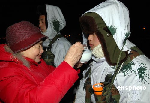 1月15日,農(nóng)歷臘月初八,黑龍江省十大杰出擁軍模范、首屆十佳“兵媽媽”王秀蘭,在黑河市封凍的界江哨位,將親手熬制的臘八粥送到執(zhí)勤的“黑河好八連”士兵口中。中新社發(fā) 邱齊龍 攝