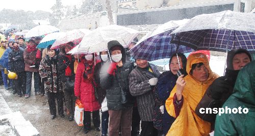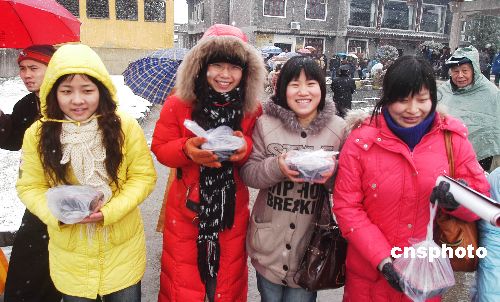 1月15日上午9時,江蘇揚(yáng)州大明寺臘八節(jié)放粥送福發(fā)放處,近千市民冒雪排長隊(duì)領(lǐng)取免費(fèi)臘八粥和“!弊。當(dāng)日清晨5時,該寺廟開始放粥送福活動。中新社發(fā) 范友林 攝