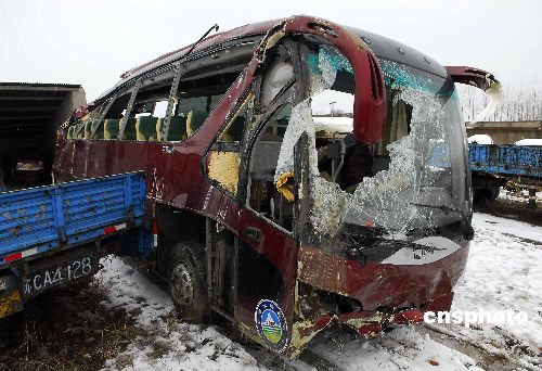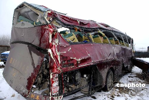 2008年1月20日深夜,一輛從蘇州發(fā)往安徽阜陽的大巴行駛至104國(guó)道明光市境內(nèi)時(shí),翻下路邊溝內(nèi),造成7人當(dāng)場(chǎng)死亡。事故發(fā)生后,當(dāng)?shù)亟痪、醫(yī)院等部門火速趕到現(xiàn)場(chǎng),實(shí)施救援。截至記者發(fā)稿時(shí),已有11人死亡,51人不同程度受傷。傷者正在醫(yī)院接受治療,除了兩名重傷者沒有脫離危險(xiǎn)外,其他傷者暫時(shí)無恙。據(jù)了解,此車核載51人,實(shí)載72人。事故原因具體尚在調(diào)查之中。中新社發(fā) 計(jì)成軍 攝
