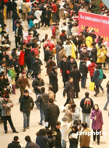 1月26日,2008年蘇州春季人才交流大會暨畢業(yè)生雙選會開場。據(jù)了解,本次“雙選會”有近500家用人單位進場招聘,為求職者提供12000多個職位。其中事業(yè)單位需求崗位1300余個、企業(yè)單位需求崗位10900多個,博士、碩士生及本科以上學(xué)歷占需求總量的53%以上。據(jù)主辦方稱,當(dāng)日進場人數(shù)可逾6萬。中新社發(fā) 蘇秀 攝