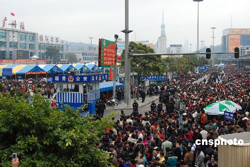 因受惡劣天氣影響,京廣鐵路一百多趟客車大面積晚點(diǎn),截至一月二十七日下午,仍有十五萬旅客被迫滯留廣州火車站廣場。中新社發(fā) 柯小軍 攝