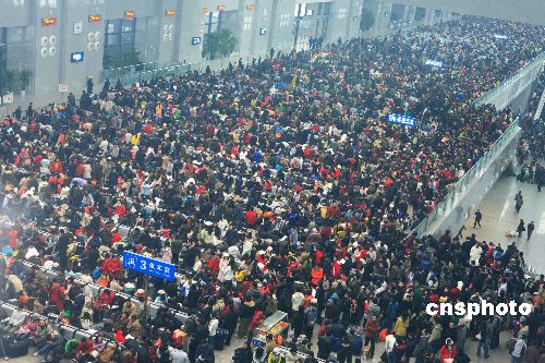 2008年1月27日下午,武昌火車站候車室內(nèi)擠滿了等待乘車的旅客。當(dāng)日,受雨雪天氣影響,廣鐵集團湖南境內(nèi)京廣線供電接觸網(wǎng)多處斷電,電力機車無法通行,致使旅客列車出現(xiàn)多列晚點。武昌火車站采取措施,在新落成的候車室內(nèi)開通暖氣,確保滯留旅客不受凍。中新社發(fā) 宋建春 攝