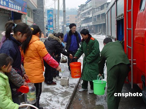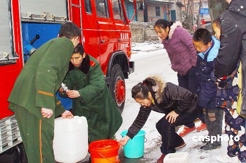 1月28日,重慶黔江消防官兵為自來水中斷近一周的交通西路居民送水到戶。連日來,重慶市近10個區(qū)縣普降大雪,部分地區(qū)積雪最深度甚至超過20厘米,由于大雪覆蓋,天氣寒冷,一時間,黔江、武隆、酉陽、彭水等區(qū)縣均出現公路結冰、電力中斷、市民飲水困難情況,對群眾生活造成極大困繞。中新社發(fā) 王松 攝