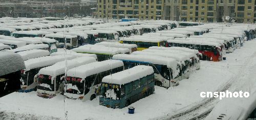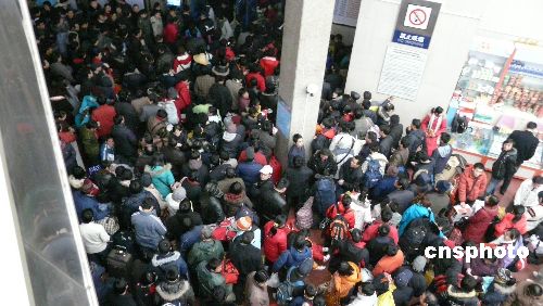 1月27日18點 、28日6點安徽省合肥市兩次發(fā)布暴雪紅色警報。1月28日,在合肥火車站廣場上,上萬名旅客在暴雪中排隊購票。合肥汽車客運全線停運,鐵路客運乘客猛增。暴雪同樣導致了多趟列車晚點,火車站站臺上、大廳內擠滿了急于返鄉(xiāng)的民工。由于鐵路部門也無法確定火車進站的具體時間。部分旅客在站臺吃方便面充饑御寒,等待列車的到來。目前合肥火車站正全力疏導,安撫旅客。中新社發(fā) 成展鵬 李君 攝