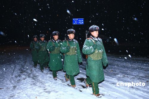 2008年1月28日,武警戰(zhàn)士雪夜中巡邏在武漢長江大橋上。擔(dān)負武漢市長江大橋守衛(wèi)任務(wù)的武警武漢市支隊官兵,在武漢市連續(xù)多日暴雪天氣里,不畏風(fēng)雪,認真守衛(wèi)著長江大橋,確保京廣鐵路和過江車輛暢通無阻。中新社發(fā) 宋建春 攝