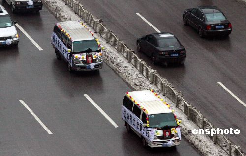 1月30日上午,長沙民眾送別在雪災中因除凍搶修電路殉職的湖南三位電力員工。據(jù)悉,三位烈士于1月26日在長沙電廠至沙坪變電站五百千伏線路上人工除冰時,因線路覆冰太厚、鐵塔不堪重負從50余米的高空墜地,周景華當場殉職,羅海文、羅長明被緊急送往醫(yī)院后搶救無效身亡。正在湖南視察雪災災情的國務院總理溫家寶29日專程看望了烈士家屬。
