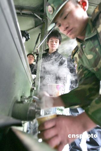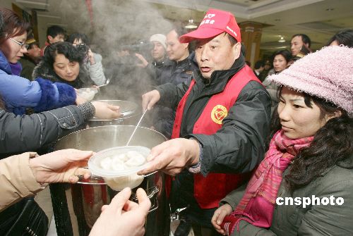 近期由于受大雪天氣影響導(dǎo)致國內(nèi)大范圍的鐵路、公路交通受阻或中斷,使大批返鄉(xiāng)旅客滯留杭州火車站、杭州火車東站和市區(qū)各大長途汽車站,從1月27日起,杭州市開辟了部分劇院、大廈、會展中心、體育館等公共場所及搭建軍用帳篷等作為滯留旅客的臨時駐留點。至1月30日下午,已先后接待了近10萬人次的滯留旅客,當(dāng)?shù)氐恼块T、企事業(yè)單位、部隊、公安、街道、衛(wèi)生、共青團、市民志愿者等紛紛行動起來,按照“有水喝、有飯吃、有地方安頓、生病有醫(yī)治、困難群眾有救助”的要求,以各種形式盡力為所有滯留旅客提供生活保障和溫馨服務(wù)。 中新社發(fā) 李忠 攝