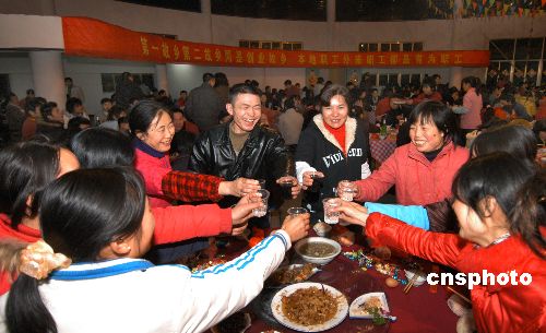 1月31日晚,浙江義烏一公司領(lǐng)導(dǎo)與留守在企業(yè)的400余名員工一起吃年夜飯。近段時(shí)間,由于遭受極端雨雪冰凍天氣,義烏100多萬外來民工中有20多萬人不能返鄉(xiāng)過年。中新社發(fā) 張建成 攝