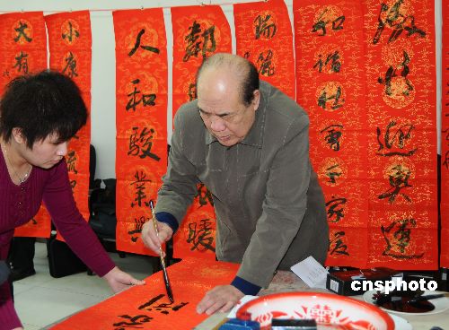 2月1日,中國書法家協(xié)會(huì)組織著名書法家二十余人到北京近郊農(nóng)村書寫春聯(lián),把喜慶送到普通農(nóng)民家庭。中新社發(fā) 楊佐桓 攝