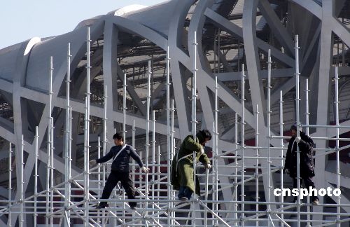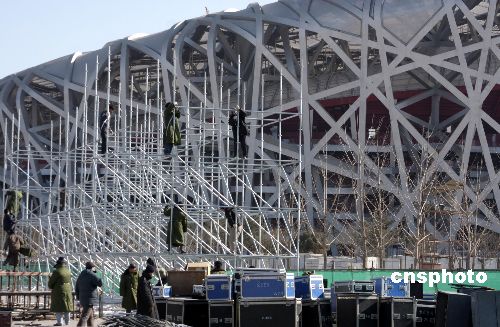 2月1日,工人在北京“鳥巢”奧運(yùn)工地搭設(shè)晚會(huì)舞臺,迎接大年三十晚會(huì)到來。據(jù)了解,今年春節(jié)“鳥巢”工地將有五六百名工人堅(jiān)守在各自崗位上,這場晚會(huì)專門為他們準(zhǔn)備的。中新社發(fā) 吳芒子 攝