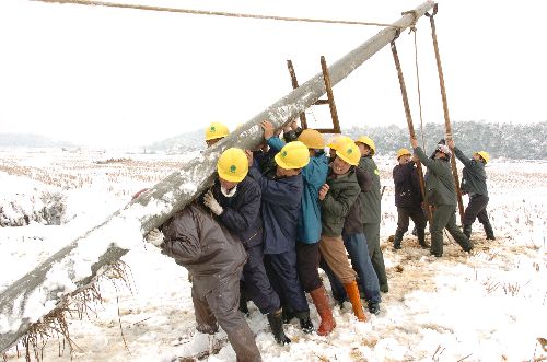 2月2日,江西萬年縣齊埠鄉(xiāng)盤田村,20名農(nóng)電工人在緊張忙碌。自1月12日以來,萬年縣遭遇罕見的強冰凍暴風雪天氣,全縣電力設施遭到嚴重破壞。萬年縣供電部門迅速啟動應急方案,組織10多個維修隊分赴受災鄉(xiāng)鎮(zhèn),加班加點,進行搶修。中新社發(fā) 朱文標 攝