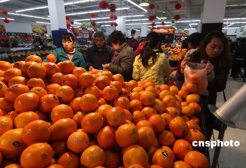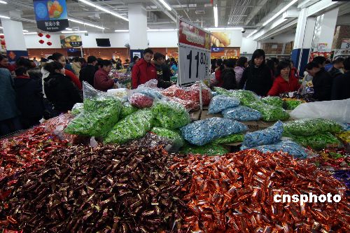 2月4日,婁底市民在超市選購(gòu)年貨。近日湖南婁底市遭受了50年一遇的冰凍災(zāi)害,全市95個(gè)鄉(xiāng)鎮(zhèn)不同程度受災(zāi),倒塌房屋15337間,緊急轉(zhuǎn)移安置11282人,因?yàn)?zāi)摔死2人,農(nóng)作物受災(zāi)面積108.71畝,當(dāng)?shù)馗咚俟贰?guó)道、省道在冰凍期間不暢通。在抗冰雪凍災(zāi)中,婁底市迅速采取應(yīng)對(duì)措施,市民及各企業(yè)單位共同參與,將冰凍災(zāi)害損失降到最低限度。隨著春節(jié)來(lái)臨,婁底市節(jié)日市場(chǎng)購(gòu)銷(xiāo)兩旺、貨足價(jià)穩(wěn),市民們紛紛忙于采買(mǎi)年貨。中新社發(fā) 郭國(guó)權(quán) 攝