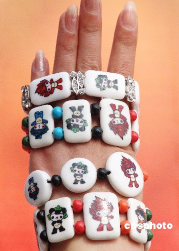 在江西省景德鎮(zhèn)營業(yè)員展示奧運福娃瓷手鏈。