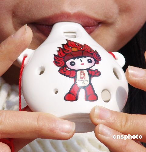 在江西省景德鎮(zhèn)營業(yè)員吹奏“唱響福娃塤”。