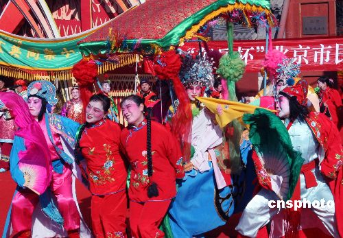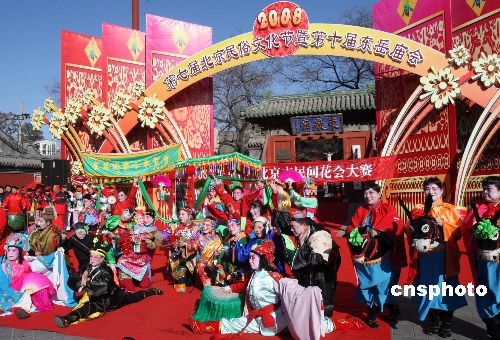 2月6日,“第七屆北京民俗文化節(jié)暨第十屆東岳廟春節(jié)文化廟會”在喜慶熱烈、歡樂祥和的氛圍中開鑼。東岳廟作為北京奧運會主場館所在地朝陽區(qū)唯一的民俗類專題博物館,是次廟會以“祈福納祥迎奧運”為主題,活動內容精彩紛呈,既有傳統(tǒng)的非物質文化遺產展示,亦有新增加的民俗活動“請福牌”、“畫福布”、“請五!薄ⅰ皰毂P香”等活動。同時“東岳杯”朝陽區(qū)民間花會大賽的11個區(qū)縣、32檔花會也同臺競技。中新社發(fā) 錢興強 攝
