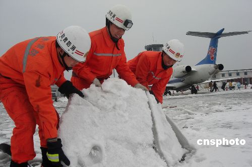 2月4日至5日,貴州銅仁地區(qū)公安消防、武警、民兵應(yīng)急分隊600余人出動裝載機、推土機、清雪車和灑水車,在銅仁大興機場使用消防水槍清除跑道冰雪,以確保機場在2月6日恢復(fù)通航。背景資料:貴州銅仁地區(qū)大興機場是貴州第一個支線機場,現(xiàn)已開通直接往返北京、廣州、深圳、重慶、貴陽、長沙等大中城市的航班。據(jù)悉,該機場從1月12日遭受嚴(yán)重凝凍天氣以來停航至今。中新社發(fā) 陳曉嵐 攝