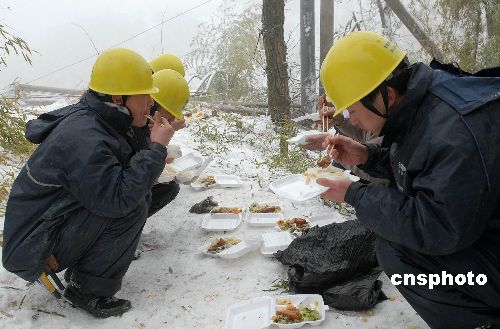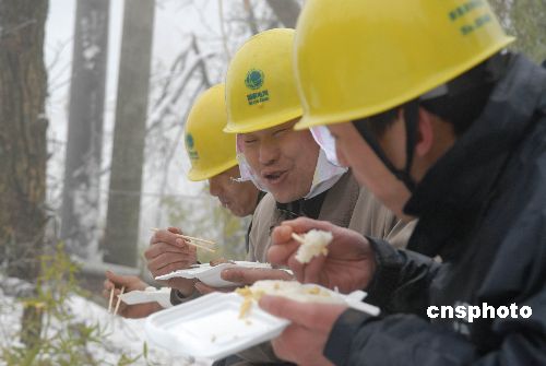 2月6日下午1點,新昌城關供電營業(yè)所城區(qū)供電服務班班長梁雍和他的隊員們一起在施工現場吃中飯。當日,浙江新昌縣供電局城關供電營業(yè)所的員工在該縣城南鄉(xiāng)搶修秦巖177線,目前,新昌有35個行政村因雪災尚未通電,561名電力搶修隊員仍奮戰(zhàn)在搶修一線。據悉,電力工人們?yōu)樵缛胀,年夜飯也只能在山上吃了。中新社發(fā) 袁云 攝