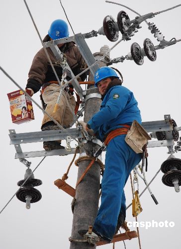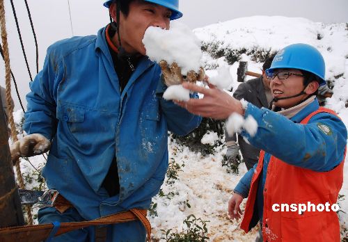 2月6日,電力搶修隊(duì)員在海撥600米的高山雪地里吃年夜飯。據(jù)悉,近日雪災(zāi)造成浙江嵊州21條主要供電線路中斷供電,該市供電局每天出動500余人進(jìn)行抗災(zāi)自救。2月6日,該市供電局200多名黨員干部組成6支電力搶修突擊隊(duì)員,對該市貴門、里南、長樂3個未通電鄉(xiāng)鎮(zhèn)開展春節(jié)供電大會戰(zhàn),當(dāng)晚6時前,該市全面修復(fù)供電,實(shí)現(xiàn)新春零斷電。中新社發(fā) 張亮宗 攝