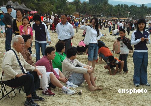 圖為三亞大東海景區(qū)沙灘上休閑的游客。